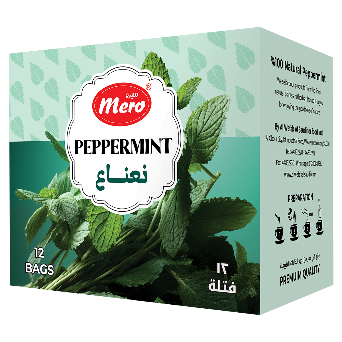 Al Wefak Al Saudi for Food Industries presents Mero Peppermint Herbal Tea, crafted from pure, dried peppermint leaves for a refreshing, cooling flavor and soothing aroma.