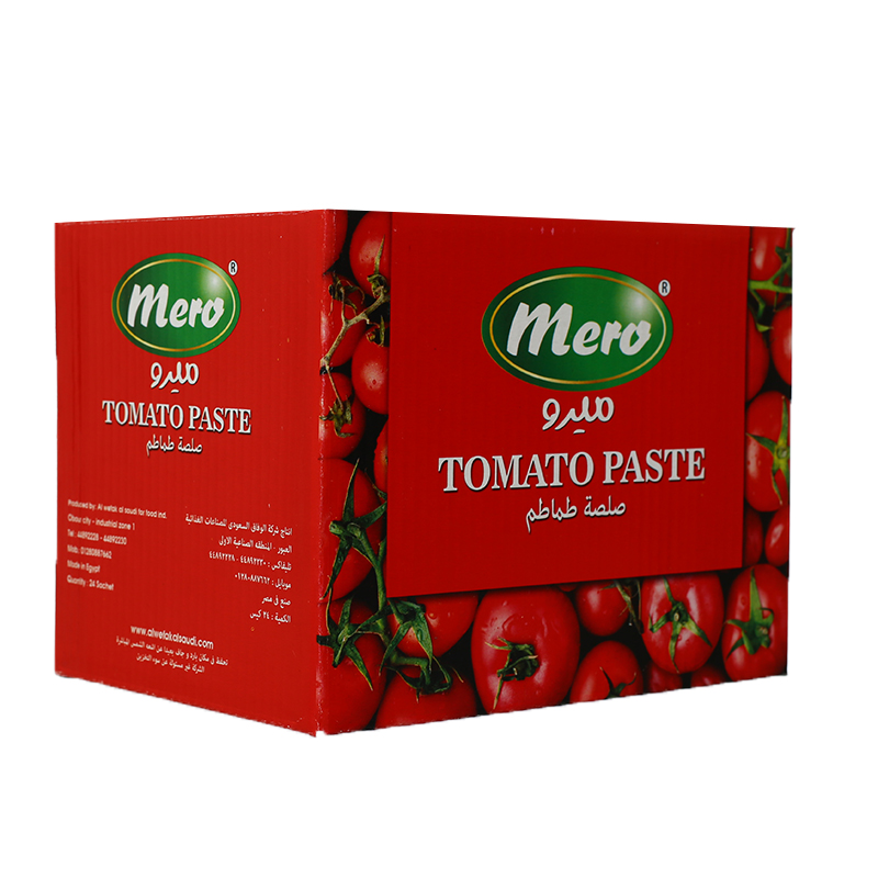 Al Wefak Al Saudi for Food Industries offers Mero Tomato Paste in convenient 35g sachets, packed in boxes of 24 units, ensuring freshness and perfect portion cont